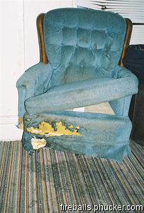 The aftermath of the first time this chair started on fire. Note the burn marks on the floor as well. Eventually, this chair was unusable due to the extensive burning.