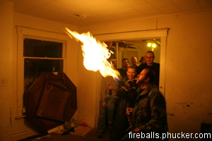 This is the wooden frame of a couch on fire after a overly fuel rich fireball. The cushions have been removed and there was likely little damage from this fire, despite the looks of it. None the less, fires like this are likely to result from blowing fireballs indoors. This fire was likely extinguished with wet towels.